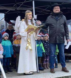 Das Christkind (Marlene Biller) stimmt die Weihnachtsmarktbesucher mit dem Prolog auf die Weihnachtszeit ein.