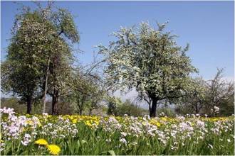 Eine Streuobstwiese erlaubt eine Nutzung auf zwei Etagen: am Boden als Grünland oder Weide, darüber für das Obst. Dünger und Pestizide sind tabu!!! Die Bäume haben genügend Platz, um große Baumkronen auszubilden und auch in Würde altern zu können. Genau das macht sie zu wertvollen Lebensräumen, die unsere Kulturlandschaft mit einer enormen Artenvielfalt bereichern.