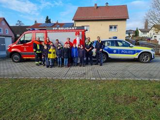 Am Samstag, den 16.12.2023, fand die letzte Gruppenstunde für das scheidende Jahr der Kinderfeuerwehr Seugast statt. Während die Kinder am Basteln waren, ging plötzlich der Alarm der Betreuer. Ein echter Einsatz? Die Kinder schauten als sich die Kameraden umzogen. Und schon fuhr das Feuerwehrauto mit Blaulicht und Horn vom Hof. Es dauerte einige Zeit, bis das Fahrzeug zurückkam. Aber was ist jetzt los, dachten sich unsere Kinder. Ans Gerätehaus kehrte ein Fahrzeug der Polizei und unser Feuerwehrauto zurück. Doch damit nicht genug, stieg doch aus dem Feuerwehrauto plötzlich auch der Nikolaus mit aus.