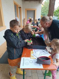 In bereitgestellte flache Wannen wurden zwei unterschiedliche Substrate zur Verfügung gestellt. Eine Wanne enthielt Erde aus dem Kompost, die andere Wanne Erde vom Ackerboden aus dem Naturgarten der Familie Dotzler.
