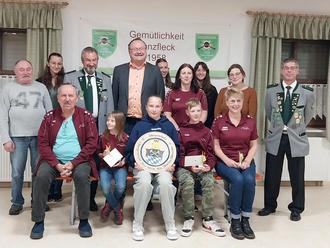 Hervorragende Ergebnisse erzielten die Teilnehmer am Bürger-, Vereins- und Marktratsschießen der Marktgemeinde Freihung. 1. Bürgermeister Uwe König bedankte sich beim Schützenverein Gemütlichkeit Tanzfleck für die Organisation und Ausrichtung. Zusammen mit 2. Schützenmeister Markus Götz und Sportleiter Christian Ertl übergab er die Pokale und Geldpreise. Es hatten 32 Mannschaften mit 104 Schützen aus verschiedenen Vereinen der Marktgemeinde Freihung daran teilgenommen. Die von Christina Stauber handbemalte Bürgerscheibe gewann Marlies Döbereiner mit einem beeindruckenden 139,2-Teiler vom ausrichtenden Verein und setzte sich damit gegen die Konkurrenz durch. Einzelsieger bei der Jugend wurde Rebecca Ertl mit einem überragenden 5,0-Teiler vor Florian Pröm und Moritz Klier, jeweils Schützenverein Gemütlichkeit Tanzfleck. In der Mannschaftswertung der Jugend gewann Gemütlichkeit Tanzfleck Jugend I (Rebecca Ertl, Florian Pröm, Marlies Döbereiner) den 1. Platz vor Gemütlichkeit Tanzfleck Jugend III (Maximilian Kohl, Mensur Hodzic, Melvin Lohr) und den Youngsters Freihunger Kirwaleit (Annabell Colyer, Nelly Kämmerer, Marlene Biller).