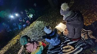 So ließen sich die mit Taschen- oder Stirnlampen beleuchteten Kinder bei der Fürchte-Führung von Höhengau zur in Stein gehauenen Kehlkapelle mitnehmen. Dort, mitten im finsteren Wald, las Hahnbachs BuchHaus-Chefin Conny Kemmel aus dem Buch "Die Mitternachtsschule - Erste Stunde Geisterkunde" vor. Todesstill lauschten die Teilnehmer, nur unterbrochen von Tierrufen und Waldgeräuschen. Einen leichten Kloß im Hals konnten sie sich anschließend mit Kinderpunsch und Breze "runterspülen". Auf dem Rückweg kündigten bereits einige Spukliebhaber an, auch im nächsten Jahr gerne wieder am Waldgruseln teilzunehmen.
