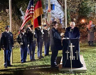 Glombitza erinnerte an die horrenden Verluste von Menschenleben in den Weltkriegen auf allen Seiten: "Darunter viele junge deutsche Soldaten, die gewissenlos als Kanonenfutter verheizt wurden als der 2. Weltkrieg längst verloren war." "Was aber haben wir nun aus diesem bisher folgenreichsten Konflikt der Menschheitsgeschichte angesichts der schrecklichen Bilder aus dem Kriegsgebieten Ukraine, Israel und Gaza gelernt?", fragte Glombitza dann. Krieg, Gewalt und Unterdrückung könnten niemals die Lösung von Konflikten sein, das sollten wir in Europa gelernt haben. Die Kriegsgräber seien Orte des Erinnerns und der Mahnung zugleich. Längst seien es Enkel und Urenkel, die Fragen stellen würden, denen ein Grabkreuz oder Name auf einer Stele viel bedeuten würden. Derzeit laufe, trotz Krieg in der Ukraine und politischen Spannungen mit Russland, in Weißrussland die Notausbettung von 2000 deutschen Soldaten. Hunderte von Erkennungsmarken seien aufgefunden worden.