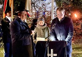 Richard Glombitza stimmte die Anwesenden am Ort des Gedenkens nachdenklich, wenn er zu Beginn seiner Ansprache betonte: "Es ist wieder Krieg in Europa. Wir jedoch wollen hier ein Zeichen setzen für ein friedvolles und respektvolles Miteinander. Wir wollen einstehen für Frieden, Freiheit und Demokratie. Kriege und Gewalt können niemals und nirgendwo eine Lösung sein. Das sollten wir aus den beiden Weltkriegen mit seinen Millionen von Kriegstoten gelernt haben."