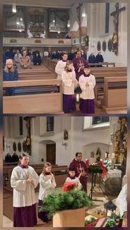 Beim Vorabendgottesdienstes am Samstag, 20. Dezember 2025, zog Pfarrer Benny-Joseph mit den Ministranten Anja Negel, Lukas Rodriguez und Lina Ringer - die in einer Laterne das Friedenslicht aus Bethlehem trug - feierlich in die Kirche ein. Anja Negel zündete vom Friedenslicht am Adventskranz die vierte Kerze an.