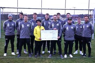 Frau Birgit Specht übergibt den Scheck stellvertretend an Kapitän Patrick Schlosser (Bildmitte)