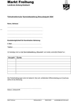 Die Gemeinde weist darauf hin, dass sie keine Garantie für den Erhalt der Wunschsorte geben kann. Die Ausgabe der Bäume erfolgt Ende Oktober/Anfang November. Sollten die Kosten pro Baum den Fördersatz übersteigen, muss der Differenzbetrag bei Abholung bar bezahlt werden. Zeit und Ort werden noch bekanntgegeben.