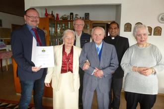 Bürgermeister Uwe König gratulierte im Namen der Marktgemeinde als auch für den Landkreis mit Urkunde, Blumen und Einkaufsgutschein. Die Segenswünsche der Pfarrei überbrachten Pfarrer Benny Joseph und Kirchenpfleger Eduard Neydert. Das Jubelpaar, das Pfarrer Benny nach gemeinsamem Gebet segnete, freute sich auch über schriftliche Glückwünsche von Ministerpräsident Markus Söder, Landrat Richard Reisinger, MdB Susanne Hierl und MdL Harald Schwartz.