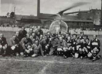 Der gelandete US-Hubschrauber mit den Mannschaft vom 1. FC Nürnberg und FC Freihung (links kniend: 1. Vorsitzender Carl Schröder, später Ehrenmitglied).