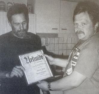 Für seine besonderen Verdienste um den FC Freihung wird Josef Saal (links) von Vorsitzenden Hermann Lühr am 27. Juli 1997 zum 15. Ehrenmitglied ernannt.