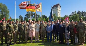 (1. Reihe von links:) Feldwebel d.R. Hans Rötzer, OTL d.R. Werner Gebhard, Command Sergeant Major (CSM) Jason Towns (16. SB), OTL d.R. Norbert Bücherl, LtCol Michelle Updike, Mary, Robert und LtCol Nicholas Gauvin, Heinz Schmidt, Dr. Dario Vidojković, Bürgermeister Uwe König, BSB-Bezirksvorsitzender Horst Embacher, Brigadekommandeur Col Matthew Alexander, Heidi und Gerhard Lindthaler, CSM Douglas Glover (18. CSSB).