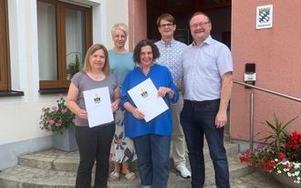 Übergabe der Zertifizierungsurkunden v.l. Birgid Baldauf, Claudia Siegert, Christine Ködel, Geschäftsleiter Max Heindl und 1. Bgm Uwe König