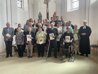26 evangelische Christinnen und Christen erinnern sich in Kaltenbrunn an ihr erstes heiliges Abendmahl vor 25 bis 75 Jahren