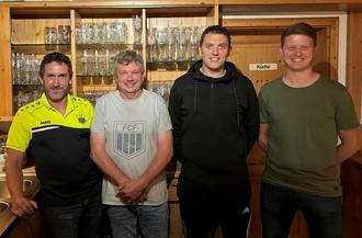 Jürgen Grundler (Zweiter von links) wird an seinem „neuen Arbeitsplatz“ herzlich willkommen geheißen, weiter im Bild von links: 1. Vorsitzender Alfred Negel, Kassier Dominik Spies und 2. Vorsitzender Philipp Leinhäupl