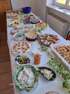 Jede der teilnehmenden Frauen, bereitete etwas vor, brachte es mit, um eine reichhaltiges Frühstücksbuffet aufzubauen. Es bat sich eine Auswahl an verschiedenen Broten, Brötchen, hausgemachten Brotaufstrichen, Aufschnitt, Käse, Rühr- und gefüllten Eiern, süßen und pikanten Belägen, sowie viele Salate, frisches Obst und Gemüse.