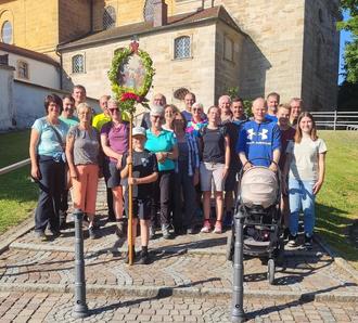 Mit dem Lied "Wir ziehen zur Mutter der Gnade", gestärkt mit dem Pilgersegen von Pfr. Benny Joseph und dem Entzünden der Pilgerkerze durch Michael Negel, machte sich eine sehr überschaubare Anzahl an Fußwallfahrern bei angenehmstem Pilgerwetter bereits um 2.30 Uhr auf den Weg zum Mariahilfberg nach Amberg. Das Gnadenbild trugen abwechselnd Andreas Riegel, Thomas Wiesneth, Alfred Negel und Uli Böhm. Das Vorbeten und Singen übernahm Karin Amann. Die Feuerwehr mit Fahrer Josef Amann und Martin Stauber mit dem Privat-PKW übernahmen die Absicherung der Wallfahrtsgruppe. Besonders geschätzt wurde die in der "großen" Pause von Frank Graf in bewährter Weise zur Verfügung gestellte Sitzgelegenheit. Gestärkt durch Getränke, Kaffee, Tee, Kuchen und herzhaftem Gebäck ging es singend und betend weiter Richtung Mutter Gottes am Wallfahrtsziel. Nach einem letzten schweißtreibenden Anstieg erreichte man kurz nach 8 Uhr den Berg. Sehr erwähnenswert ist hier unser jüngster Wallfahrer Antonio Reil mit gerade mal 8 Wochen, der von seinen Eltern im Kinderwagen bis zum Mariahilfberg hochgeschoben wurde. Den im Anschluss besuchten Festgottesdienst am Freialtar zelebrierte der Amberger Stadtpfarrer Dekan Thomas Helm mit mehreren Mitkonzelebranten anderer Wallfahrtsgruppen. Die Mass Bier und die Bergbratwürste im Anschluss schmeckten nach dem anstrengenden Weg gleich doppelt gut.