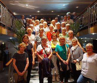 Am Donnerstag, 20. Juli startete am Spätnachmittag unsere lang geplante Sommerreise nach Regensburg. Ein Bus der Fa. Göttel aus Grafenwöhr holte die Teilnehmer/innen aus den Orten Freihung, Thansüß, Kaltenbrunn, Dürnast und Weiherhammer ab und setzte uns nach gut einstündiger Fahrt sicher in Regensburg nahe beim Haus der Geschichte an der Hafenpromenade ab. Die Zeit bis zur Abfahrt unseres Schiffes, übrigens das größte der Regensburger Kristallflotte, nutzten manche für einen kleinen Stadtbummel mit Cafebesuch, einem Spaziergang entlang am Wasser oder auch nur zum Schauen und Plaudern mit Blick auf die Donau und unsere „Kristallkönigin“. Kurz vor 19.00 Uhr war es dann soweit. Wir durften an Bord gehen. Von den 325 Innenplätzen des Schiffes waren für uns fünfzig auf der Galerie reserviert und bereits festlich eingedeckt. Beeindruckend waren die riesigen Deckenlüster aus funkelnden Swarovskisteinchen und die Blumenarrangements, die dem Raum ein luxuriöses Ambiente verliehen.