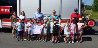 Jugendwart Richard Pröm und seine Helfer empfingen die Vorschulkinder des Kindergartens St. Marien im Feuerwehrgerätehaus Freihung. Bei der Vorstellungsrunde wurde gleich noch die eigene Adresse in den Köpfen der Kinder vertieft, um Sie im Notfall parat zu haben. Die neugierigen Besucher erfuhren vieles über die Ausrüstung der Feuerwehr. In kindgerechter Form wurde ihnen erklärt wie es zu Bränden kommen kann, was ein gutes oder schlechtes Feuer ist, das richtige Verhalten im Brandfall und das Absetzen eines Notrufes. Mit Hilfe eines kleinen Modellhauses, dem Rauchhaus, konnte man gut erkennen wie schnell ein Brand sich ausbreitet und wohin der Rauch zieht. Um den 17 Kindern die Angst vor dem seltsamen Aussehen der angekleideten Einsatzkräfte, der aufgesetzten Atemschutzmaske und der vom Atemschutzgerät ausgehenden Atemgeräusche zu nehmen, zog sich ein Feuerwehrmann schrittweise die Schutzbekleidung inklusive Atemschutzausstattung an. Auch eine Fluchthaube, mit welcher Personen aus verrauchten Gebäuden gerettet werden können, haben sich die Jungen und Mädchen angesehen und sogar aufgesetzt. Das Interesse für die Fahrzeuge der Feuerwehr war natürlich sehr groß. Abschließend durfte sich jedes Kind einmal als Feuerwehrler versuchen und mit einem Strahlrohr spritzen. Richard Pröm bedankte sich bei den Vorschulkindern für das Interesse an der Feuerwehr und überreichte Ihnen eine Urkunde und ein kleines Geschenk. Die Kinder und ihre Betreuerinnen bedankten sich im Gegenzug mit einem Lied und einem großen Bild.