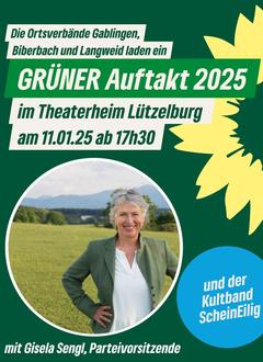 Zu Jahresbeginn laden wir, die Ortsverbände der GRÜNEN aus Gablingen, Langweid und Biberbach, gemeinsam mit dem Kreisverband Augsburg Land, alle interessierten Bürgerinnen und Bürger unserer Gemeinden ein zum GRÜNEN Auftakt 2025. Gemeinsam wollen wir am Samstag, 11. Januar, um 17:30 im Theaterheim in Lützelburg (Am Sportplatz 15) das neue Jahr begrüßen.