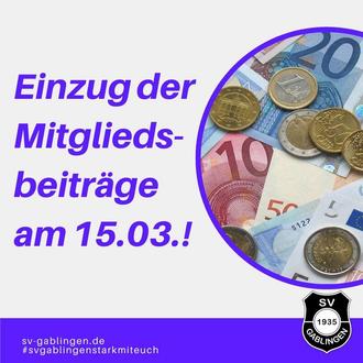 Am 15.03.2023 ziehen wir die Mitgliedsbeiträge sowohl für den Hauptverein als auch die Beiträge für die einzelnen Abteilungsmitglied-schaften ein. Sollten in der Zwischenzeit Kontoänderungen eingetreten sein, bitten wir die aktualisierten Daten an unsere Vereinsverwaltung unter verwaltung@sv-gablingen.de zu senden.
