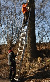 Bewaffnet mit Leiter, Akkuschrauber und neuen Nistkästen ging es ans Werk. Abwechselnd stiegen Leo und Johannes nach oben und entfernten die alten Kästen - die Neuen wurden etwas höher befestigt, um für ungebetene Gäste etwas schwerer erreichbar zu sein.
