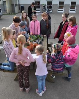 Rechtzeitig zum Frühlingsbeginn traf sich die Wühlmausgruppe des Gablinger Gartenbauvereins an der Schule. Bei schönem Wetter hatten die Betreuer/innen für die Märzaktion alles im Freien hergerichtet. Zunächst durfte sich jedes Kind aus einer bunten Menge an Frühlingsblumen ein Töpfchen aussuchen. Gar nicht so einfach, sich zwischen Hornveilchen, Osterglocken, Tulpen und Hyazinthen zu entscheiden! Schließlich hatte aber jeder seine Lieblingspflanze gefunden. Die sollte nun einen schönen Topf bekommen. Dafür nahm sich jedes Kind einen Tontopf und wählte einen Platz zum Malen. Nun konnte das Verschönern der Blumentöpfe losgehen. Mit vielen leuchtenden Farben und dicken oder dünnen Pinseln entstanden die verschiedensten bunten Muster. Die Farbexperten mischten sich eigens ihre Lieblingsfarben zusammen. Bald waren alle Töpfe mit Streifen, Punkten und Wellenlinien verziert.