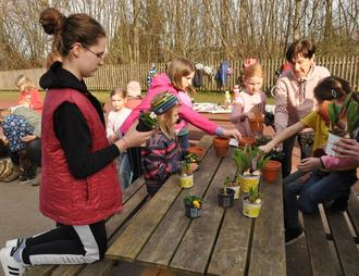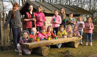 Inzwischen waren die Töpfe getrocknet die Kinder konnten ihre Pflanzen reinstellen. Der Stecker in der Erde machte das Kunstwerk vollständig. In ein paar Tagen werden die Blütenknospen aufblühen und dann wird es richtig frühlingsbunt.