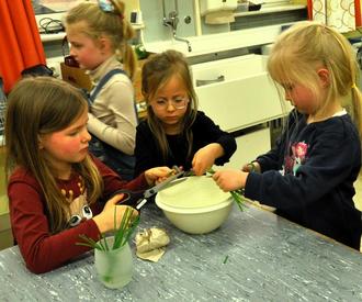 Zuletzt durften die Kinder Kräuterquark herstellen. Mit Messern und Scheren wurden Petersilie und Schnittlauch klein geschnitten. Einige Kinder rührten Quark mit Pfeffer und Salz und Milch an, der dann mit den Kräutern vermischt wurde. Nach dem Aufräumen kam der kulinarische Teil. Die Kinder strichen Quark auf frisches Brot und alle fanden, dass das richtig gut schmeckt. Im Nu war alles aufgegessen und Herr Fink schleckte noch den letzten Rest aus der Quarkschüssel! Zum Abschluss durfte jedes Kind eine Flasche Kräuteröl und ein Glas Kräutersalz mit nach Hause nehmen. Vielleicht probieren sie mit den Eltern das eine oder andere aus!