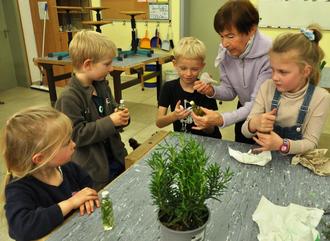 Um Kräuter haltbar zu machen, werden sie getrocknet. Die Kinder verglichen frische Kräuter mit den getrockneten. Jiih – das ist ja ganz rau und stachelig! Also, her mit dem Mörser und zu feinem Mehl reiben! Das war ganz schön anstrengend und die Kinder wechselten sich bei der Arbeit ab. Nun wurden die gemahlenen Kräuter mit Salz vermischt, in Gläschen abgefüllt und mit Servietten und Bändern verziert.