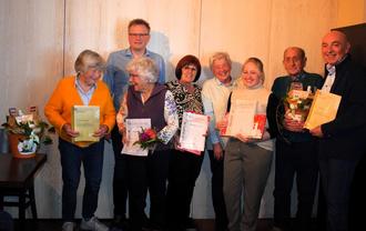 Ehrung langjähriger Mitglieder: v. l. J. Schaller, E. Wunderle, G. Weyrich (für W. Weyrich, M. Zimmermann, A. Hüller, E. Kerner. Mit dabei: C. Kaiser (hinten) und R. Mayer (rechts)