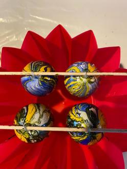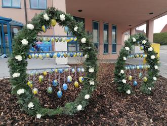 Die Wiese am Rathaus erstrahlt mit vom Team marmorierten Eiern an zwei großen, verzierten Stahleiern.