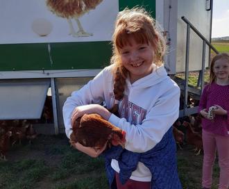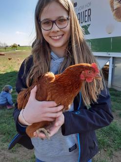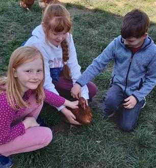 Ein besonderes Erlebnis war der Besuch bei den Hühnern in ihrem Mobilstall. Das Gehege wandert jede Woche an einen neuen Platz auf der Wiese. Einige Hühner ließen sich von den Kindern auf den Arm nehmen und genossen die Streicheleinheiten. Wer Lust hatte, durfte Eier aus den Nestern holen und in Kartons packen. Oh je, manche Eier passen nicht hinein, weil sie zu groß sind. Herr Rotter erklärte, dass diese Eier von den jüngsten Legehennen kommen. Die müssen erst noch lernen, dass es einfacher ist, jeden Tag ein kleines Ei zu legen, statt jeden zweiten Tag ein so großes.