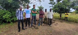 Unterschrift: v. l. Patrick, Leiter des Agogo-Projekts; Precious, Student in der Benga Parish; Matthias; Agogo Madu; zwei Dorfälteste