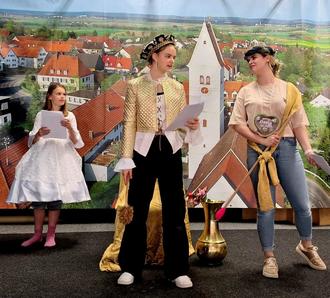 V.li. Amelie Kiendl (Königin) Miriam Schwarz (König), Kathrin Erdhofer (der schöne und mutige Herzog) )