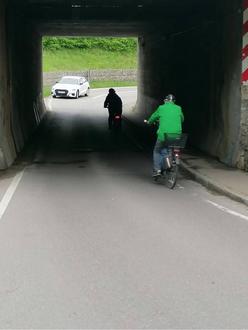 Brennpunkt Bahnunterführung – Straße sehr schmal und gefährlich für Radler:innen. Sie werden im Spiegel offensichtlich oft nicht gesehen, so dass es regelmäßig zur Missachtung der Vorfahrt kommt. Lösung? Absteigen und schieben? Der Fußweg ist zu eng. Absolut gefährlich! Hier ist eine Verbesserung dringend erforderlich!