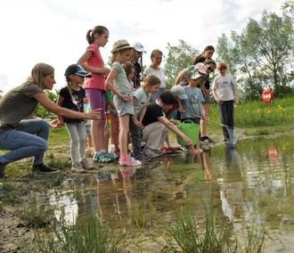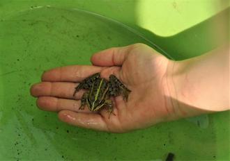 Für die Kinder war es beinahe unvorstellbar, dass aus dem kleinen schwarzen und unscheinbaren Wesen ein hübscher grüner Frosch mit vier Beinen und goldenen Augen werden kann. Ganz vorsichtig dufte dann jedes Kind einen Frosch in der Hand halten. Für die meisten war es das erste Mal und daher eine ganz intensive Erfahrung. Als die Tiere wieder ins Wasser zurück entlassen wurden, konnten die Kinder die schnellen und exakten Schwimmbewegungen beobachten.