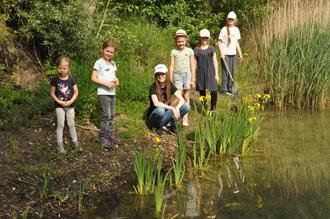 Kurze Berichte über eigene Erfahrungen stimmten die Kinder auf das Thema „Wasser“ ein. Schnell fanden sie heraus, dass hier andere Pflanzen wachsen als auf der Wiese nebenan. Schilf, Seerosen, Algen im Wasser, Sumpfgladiolen, Kresse und duftende Minze am Rand.