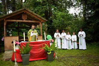 Wie immer wurde die Feier musikalisch vom Gablinger Musikverein umrahmt und die Besucher sangen kräftig mit. Der traditionelle Waldgottesdienst ist eine einzigartige Verbindung von Kirche, Musikverein und Gartenbauverein und zeigt durch die hohe Besucherzahl, wie erfolgreich dieses Zusammenwirken angenommen wird. Pater Piotr und die Vereinsvorsitzenden Simon Lauter (Musikverein) und Robert Mayer (Gartenbauverein) bedankten sich bei allen Beteiligten und Helfern für die Gestaltung dieses besonderen Gottesdienstes. Nach der Messe stärkten sich die Besucher mit Leberkäsesemmeln und Getränken und ratschten noch lange bei zwischenzeitlich sonnigem Wetter