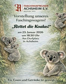 Die Faschingsfreunde Achsheim laden euch herzlich zur Präsentation unseres diesjährigen Faschingswagens unter dem Motto „Rettet die Koalas“ ein. Am Freitag, den 23.01.2026, ab 18:30 Uhr treffen wir uns auf dem Dorfplatz in Achsheim, um unseren neuen Wagen gemeinsam zu enthüllen. Für leckeres Essen sowie warme und kalte Getränke ist bestens gesorgt. Kommt vorbei, feiert mit uns und verbringt einen gemütlichen Abend – wir freuen uns auf euch!