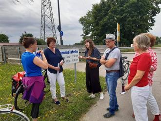 Gemeinsam radelnd ging es an die Schmutter. Hier berichtete Karina Ruf von dem stattgehabten Hochwasser und dem hervorragenden Zusammenwirken der vielen freiwilligen Hilfskräfte, der Feuerwehren und Verwaltungen. Hierdurch konnte weit größerer Schaden verhindert werden.