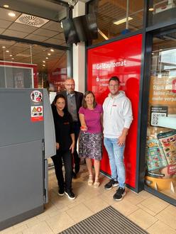 Der Geldautomat der Sparkasse Schwaben-Bodensee in Stettenhofen steht ab sofort bei REWE Gallauch. Bei einem Ortstermin dankte Bürgermeister Jürgen Gilg den Beteiligten für das unkomplizierte Miteinander. Claudia Topic, Sparkasse Schwaben-Bodensee, und Sebastian Siegmund sowie Mihaela Winkler, REWE Gallauch, präsentierten das gemeinsame Projekt Am Lehenauweg 2a in Stettenhofen. Der Geldautomat kann während der Öffnungszeiten von Montag bis Samstag zwischen 7 und 20 Uhr genutzt werden.