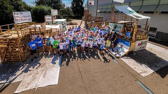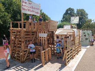 Viele Kinder freuten sich schon vor den Sommerferien auf das Stadtbauspiel 2024, so dass innerhalb weniger Tage alle Plätze vergeben waren. Von Montag, den 12. bis Donnerstag, den 15. August hämmerten, sägten und bastelten 60 Kinder insgesamt sieben Bauwerke aus Paletten und Brettern auf dem Pausenhof der Grundschule Gablingen zusammen. In den vier Tagen entstand unter anderem ein Bunker Café, die Bar „Die 10 betrunkenen Teufelsbrüder“, ein Kiosk mit Kinderschminken, das Restaurant „Die geilen Bros“ und eine Ritterburg. Bei den Bauarbeiten wurden die Kinder von jugendlichen und erwachsenen Helferinnen und Helfern, die nicht nur den ein oder anderen fachkundigen Tipp gaben, sondern auch bei Unstimmigkeiten schlichtend eingriffen und für ein harmonischen Miteinander sorgten, unterstützt. Erfreulich ist, dass bereits sieben ehemalige „Stadtbaukinder“ mittlerweile als Betreuer tätig sind. Zusätzlich zu den Arbeiten an ihren Bauwerken gestaltete jedes Kind sein eigenes Stadtbau T-Shirt.