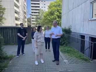 Bildunterschrift: Im Gespräch vor der Langweider Familienhilfe. V.l.n.r.Andreas Nussbaumer, Ortssprecherin Eva Kellermann, Staatssekretärin Ekin Deligöz, Heike Uhrig Grüner Kreisverband, Bürgermeister Jürgen Gilg