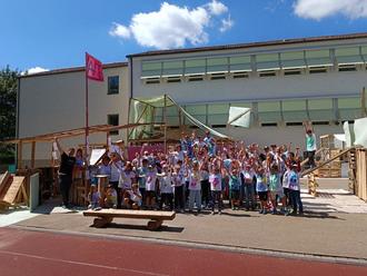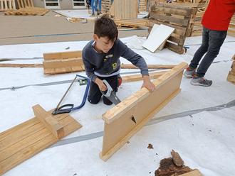 Viele Kinder freuten sich schon vor den Sommerferien auf das Stadtbauspiel 2023, so dass innerhalb weniger Tage alle Plätze vergeben waren. Von Montag, den 7. bis Donnerstag, den 10. August hämmerten, sägten und bastelten 58 Kinder insgesamt acht Bauwerke aus Paletten und Brettern auf dem Pausenhof der Grundschule Gablingen zusammen. In den vier Tagen entstand unter anderem ein Café mit Ferienhaus, eine Bruchbude, ein Kiosk mit Sonnendeck, eine Rettungswache, ein kleines Nagelstudio und sogar ein Auto. Bei den Bauarbeiten wurden die Kinder von erwachsenen Helferinnen und Helfern, die nicht nur den ein oder anderen fachkundigen Tipp gaben, sondern auch bei Unstimmigkeiten schlichtend eingriffen und für ein harmonischen Miteinander sorgten, unterstützt. Zusätzlich zu den Arbeiten an ihren Bauwerken gestaltete jedes Kind sein eigenes Stadtbau T-Shirt.