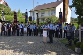 Der Festtag begann mit einer Gedenkfeier am Achsheimer Kriegerdenkmal. Sechs Fahnenabordnungen bildeten eine treffliche Umrahmung. Der 1. Vorstand Siegbert Friedel begrüßte alle Teilnehmer, insbesondere die Ehrengäste Pater Peter Kuzma, Bürgermeister Jürgen Gilg, MdL Marina Jakob, sowie alle Vereinsvorsitzenden.