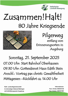 80 Jahre Kriegsende und Ende des Nazi-Terrors nehmen wir zum Anlass, unsere jährliche Wallfahrt als Pilgerweg entlang von Erinnerungsorten in Augsburg zu begehen. D.h. wer mit dem Zug ab Langweid oder Gablingen (ca. 7. 45h) mit uns zum Oberhauser Bahnhof fährt, für die beginnt es schon mit der Fahrt entlang der Route an Gablingen und Gersthofen vorbei... Auch dort ... Dann führt der Weg ab dem Oberhauser Bahnhof über gute 8 km durch Augsburg mit dem Ziel der Kapelle im Edith-Stein-Studentenwohnheim. Dort besuchen wir den Gottesdienst und hören anschließend Ideen zur Frage „Gewaltfrei wirkt?“. Dieser Vortrag eröffnet „Einen Tag für den Frieden“ katholischer Verbände.