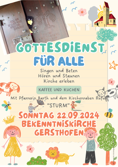 10:00 Uhr Gottesdienst für alle mit Pfarrerin Barth und dem Kirchenraben Rufus in der Bekenntniskirche Gersthofen.