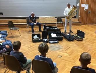 Dirigent Manfred Braun erläutert den Schülern der 3. Klasse die verschiedenen Instrumente. Mit dabei waren neben Rektorin Sabine Wirth auch die beiden Vorstandsvertreter des Musikvereins, Erwin Buck und Helmut Gensberger.