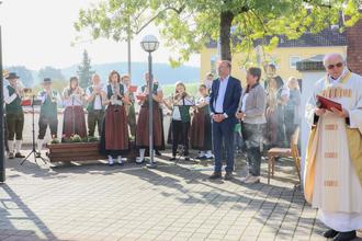 Bildtext: Im Rahmen eines Festakts an der Pfarrkirche St. Georg feierten die Anwohnerinnen und Anwohner mit Landrat Martin Sailer und Bürgermeisterin Karina Ruf den Abschluss der Arbeiten an der Kreisstraße A5. Pfarrer Franz Götz segnete die neu errichtete Stützmauer.
