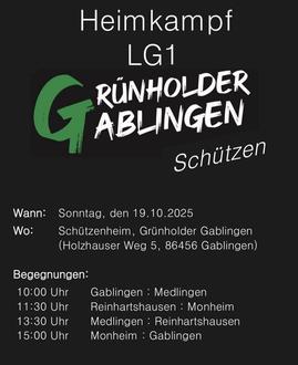 Große Freude bei der 1. Luftgewehrmannschaft: Nach einer erfolgreichen letzten Saison ist dem Team der Aufstieg gelungen, die Mannschaft tritt jetzt in der Schwabenliga an. Der erste Wettkampf in der neuen Liga findet am Sonntag, den 19. Oktober 2025 statt und das vor eigenem Publikum im Grünholder Schützenheim. Die Mannschaft freut sich darauf, ihre Leistungen auf heimischem Boden zu zeigen und hofft auf zahlreiche Unterstützung von Vereinsmitgliedern, Freunden und Fans. Der Heimkampf verspricht spannende Duelle und hochklassigen Schießsport. Zuschauer sind herzlich eingeladen, das Team zu unterstützen. Jeder Schuss wird in Echtzeit von der Elektronik erfasst und sofort im Schützenheim auf Monitoren angezeigt. Insgesamt sind es an dem Tag vier Kämpfe, die in Gablingen ausgetragen werden. Vier Mannschaften sind vor Ort, Gablingen mit dem Deutschen Meister Jürgen Weislein ist beim ersten und letzten Duell mit von der Partie.